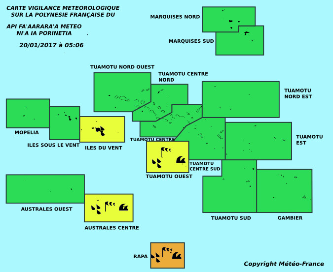 PAPEETE, le 20 janvier 2016. Les îles du Vent, les Tuamotu Ouest et les Australes centre sont en vigilance jaune. Les îles sous-le-Vent ne sont plus sous vigilance. Voici les dernières prévisions météorologiques de Météo France.