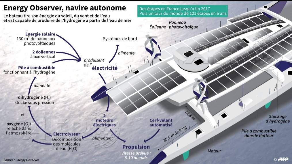 Chacune des technologies sélectionnées par Energy Observer est testée à bord au fur et à mesure des navigations. "C'est un démonstrateur expérimental. On continue à tester des briques technologiques, à les changer quand elles ne vont pas. Le bateau, c'est un laboratoire", a déclaré à l'AFP le capitaine du bateau Victorien Erussard.