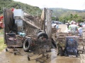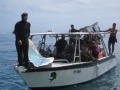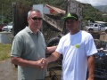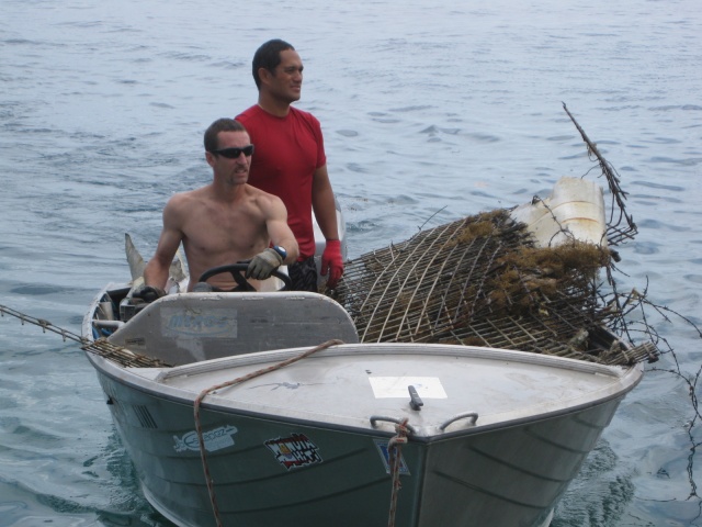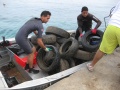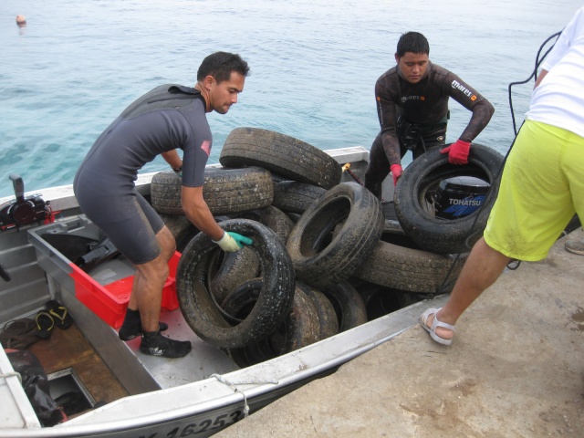 De 8 heures à 12h les bateaux et bénévoles à terre se répartissent sur la zone. Si les premières heures, les plongeurs constatent que les zones longeant le littoral sont plus propres que d’habitude ils déchantent vite car arrivés devant les pirogues de Punaauia, ils retrouvent les éternels pneus laissés par les piroguiers. Du côté du lagoonarium, on a tranquillement « rangé » toutes les ferrailles, héritage des précédents parcs à poisson, sous le ponton. Les plongeurs en apnée récupèrent ce qu’ils peuvent et remplissent 2 à 3 bateaux…