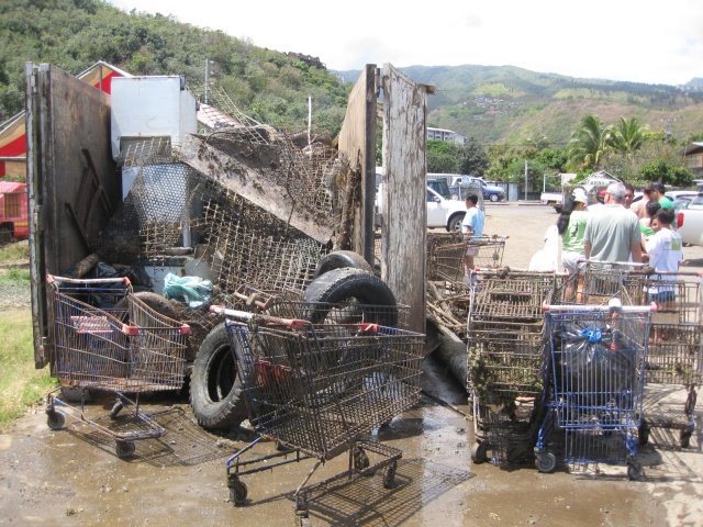 L’amicale des muto’i municipaux de Punaauia décident d’aller prospecter plus loin du côté de la marina taina qui arbore son beau pavillon bleu ainsi que la zone du maeva beach qui accueillera bientôt un gros projet touristique. Sur zone, ils découvrent des fonds infestés de caddies et détritus en tous genres (batteries, plastiques, cannettes). Les pompiers, de solides gaillards pourtant et habitués à supporter des scènes difficiles lors des accidents, lâcheront quelques larmes désabusés par tant d’incivisme.