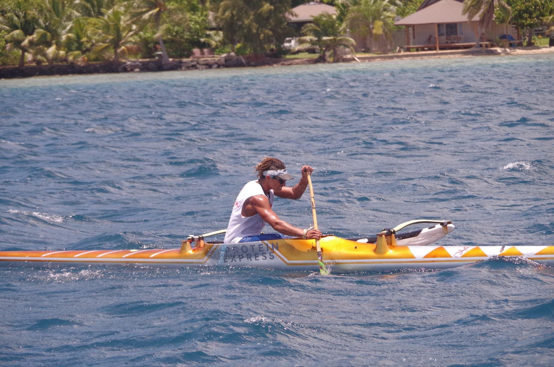 En raison des conditions météorologiques, le parcours de quelques kilomètres prévu au large a été supprimé. Dès le départ, Eremoana Manuel et Bruno Tauhiro, tous deux membres du club de Tuaiva Nui, ont accéléré pour prendre la tête de la course. On a alors assisté à un duel sur plusieurs kilomètres entre les deux rameurs de l’île sœur avec notamment plusieurs accélérations de Bruno Tauhiro. Au retour, Randy Teremate, de Haumi Mooz, est revenu sur le duo de tête dans le lagon de Patae pour se placer à la deuxième place et reléguer Eremoana Manuel à une trentaine de mètres derrière lui. Ce dernier a toutefois trouvé les ressources nécessaires pour repasser devant Randy au niveau du lagon de Temae avant finalement de s’imposer au sprint devant Bruno Tauhiro en 1h30' à la plage publique.