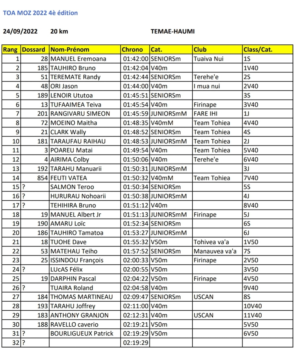 L’expérimenté Bruno Tauhiro est donc arrivé second de la course avec un chrono de 1h30'04, mais sort vainqueur chez les vétérans de plus de 40 ans. Le podium des séniors hommes est complété, en seconde position, par Randy Teremate, qui accuse un retard de 44 secondes sur le vainqueur et en troisième position par Ututoa Lenoir, de Manutahi.