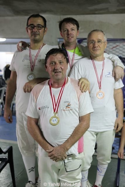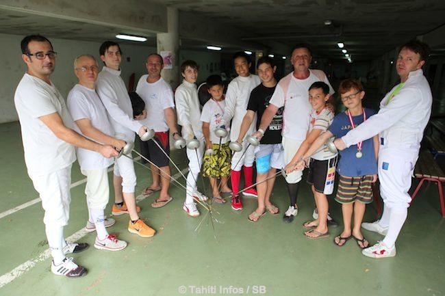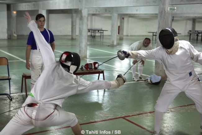 PUNAAUIA, le 10 juin 2014. Le Tiki Club, qui comporte environ 120 licenciés, a proposé deux jours de compétition qui se sont déroulés dans le parking du lycée Hôtelier de Punaauia où les quelques escrimeurs de Tahiti se retrouvent pour pratiquer leur sport. Une petite zone aménagée dans le garage leur permet de stocker leur matériel. Le garage résonne et les compétiteurs crient après chaque échange, l’intensité nerveuse est à son paroxysme. Le Maître d'armes Bruno Sanchez explique pour rassurer que 'nous nous crions à nous mêmes, on n'insulte pas du tout l'adversaire.’