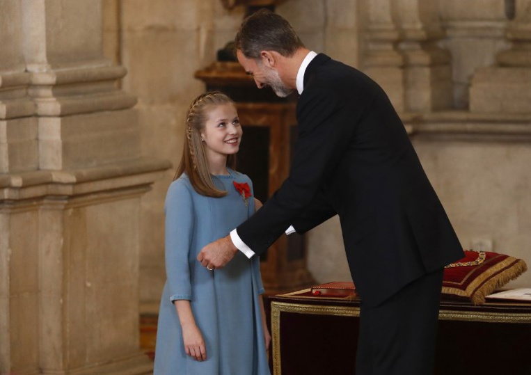 Lors de la cérémonie au Palais royal, la princesse au visage angélique est apparue souriante et intimidée, entre son père, souverain depuis juin 2014, et son grand-père, Juan Carlos 1er, qui a régné 38 ans.