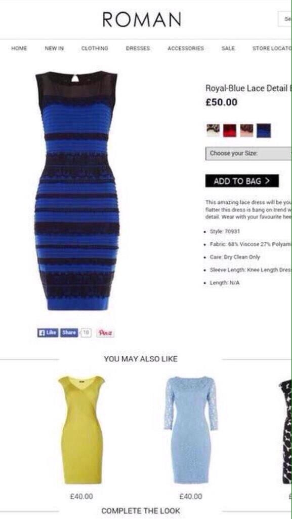 Heureusement le site Mashable a enquêté et déniché la boutique qui commercialise le vêtement: il s'agit de la marque britannique Roman Originals. Sur son site la "robe moulante en dentelle bleu-roi" est à 50 livres. Au fait, la robe est bien bleue et noire.