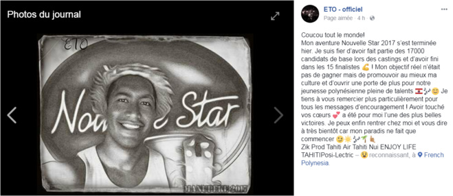 Après son élimination, Eto s'exprime sur les réseaux sociaux, visiblement ému. Il évoque sa joie d'avoir participé et sa fierté "d’avoir fait partie des 17000 candidats de base lors des castings et d’avoir fini dans les 15 finalistes" . Il ajoute que sa motivation principale en participant à cette émission était de promouvoir la culture polynésienne.