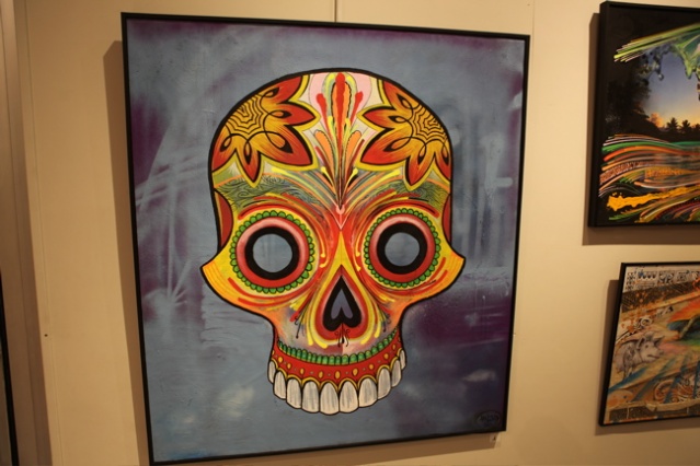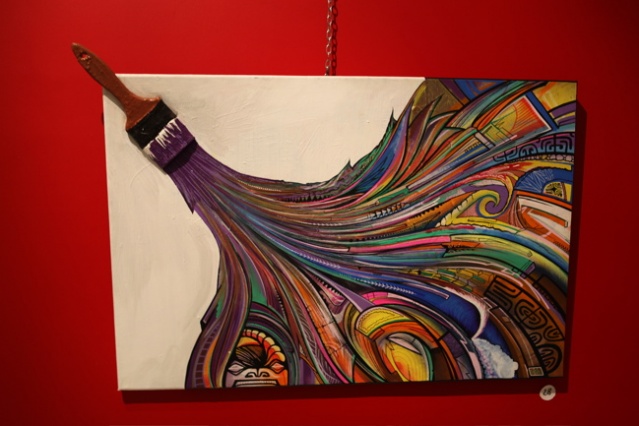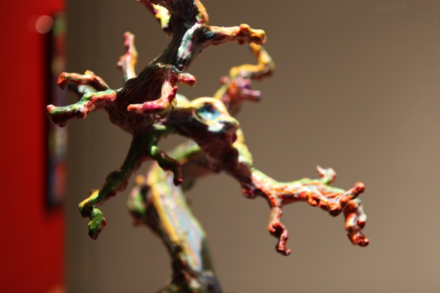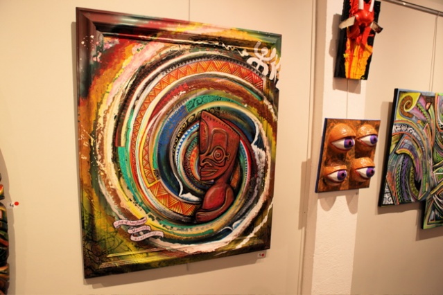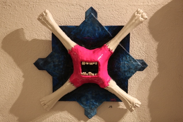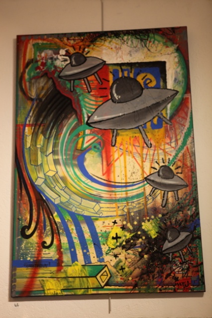 « C’est la 3ème expo d’Hell Ton John à la Galerie Winkler, la dernière il l’avait faite en duo avec Taea donc c’était différent. Il y avait moins d’œuvres et un style plus éclectique. Je pense que son style est plus construit, plus abouti. Il a encore plusieurs références, plusieurs orientations mais on sent qu’il y a déjà une signature réelle. Il signe apparemment sa 6ème exposition, c’est quelqu’un qui avance, qui aime créer, qui est libre de créer sur des supports complètement différents, sur des matières innovantes et qui n’a pas peur d’explorer de nouveaux champs. En fait cette liberté lui permet de créer son propre style, la griffe Hell Ton John on la voit et on la reconnaît. »