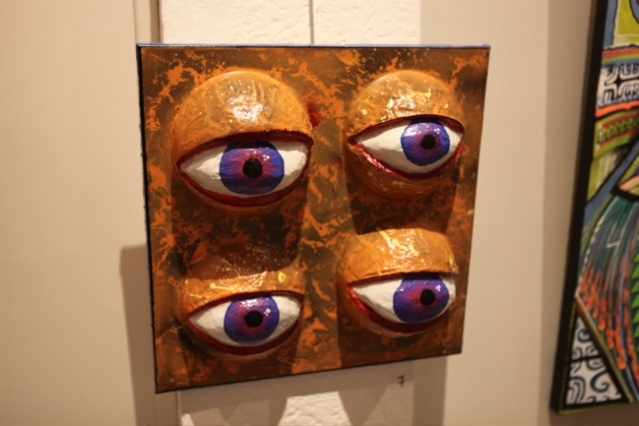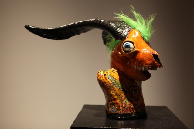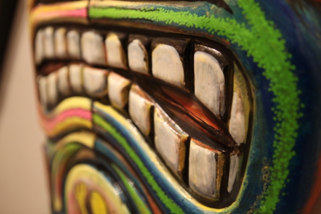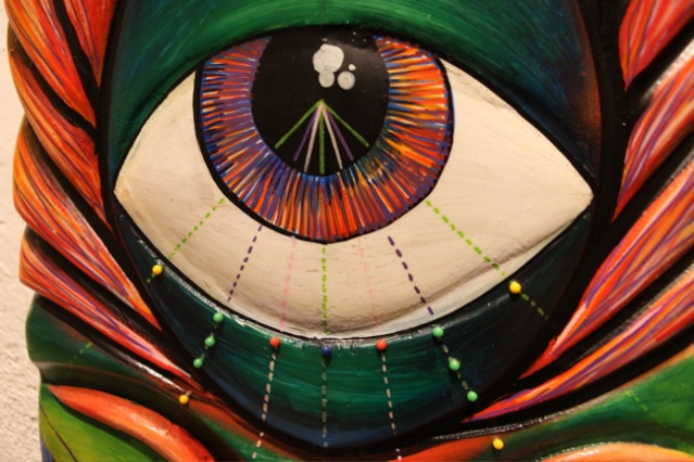 « La tête de mort, les yeux, les vagues, les tikis…je tourne systématiquement autour. Un coup je vais le faire en sculpture, un coup en papier mâché, c’est des signes que j’utilise souvent. »