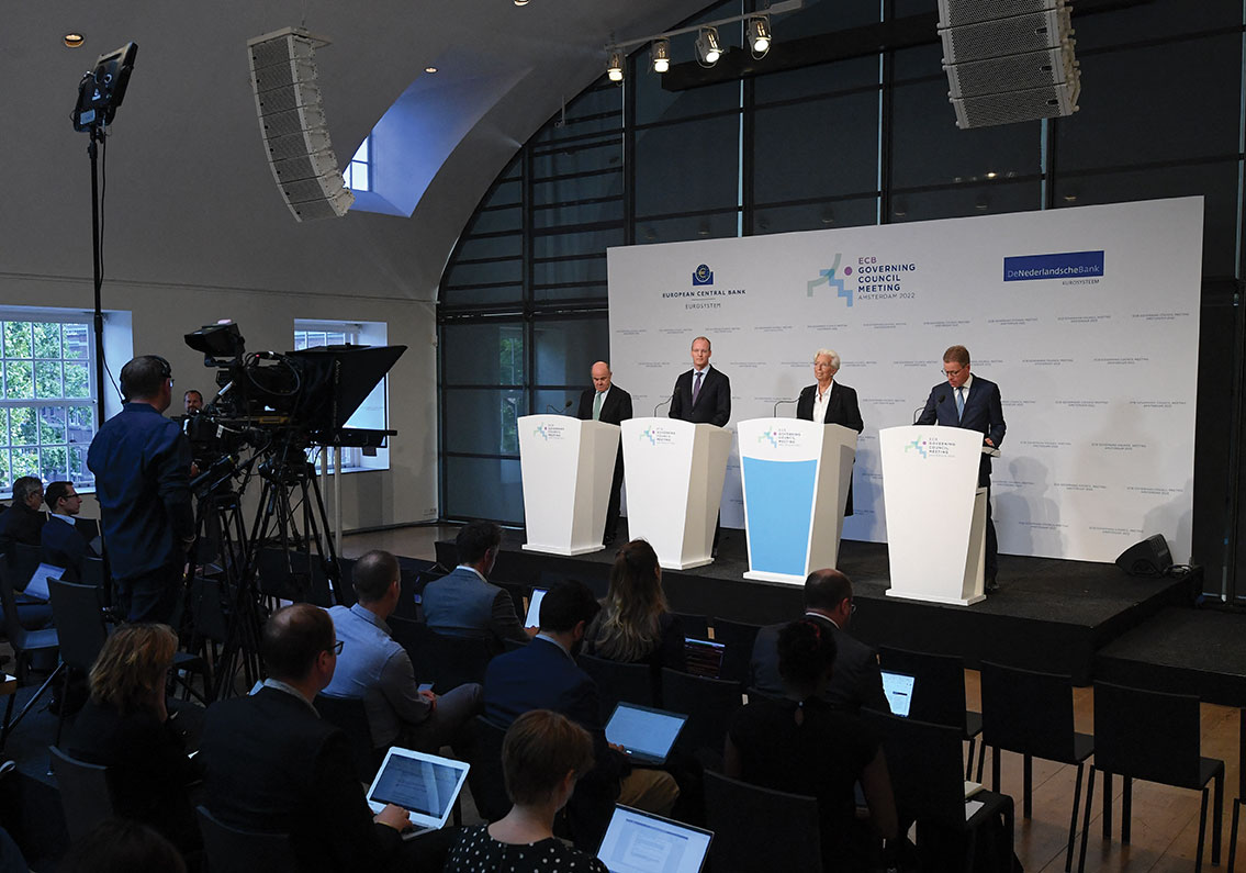 Annoncées à l'issue d'une réunion du conseil des gouverneurs, délocalisée à Amsterdam, ces décisions, largement attendues, marquent un tournant historique après des années de politique d'argent pas cher et abondant.