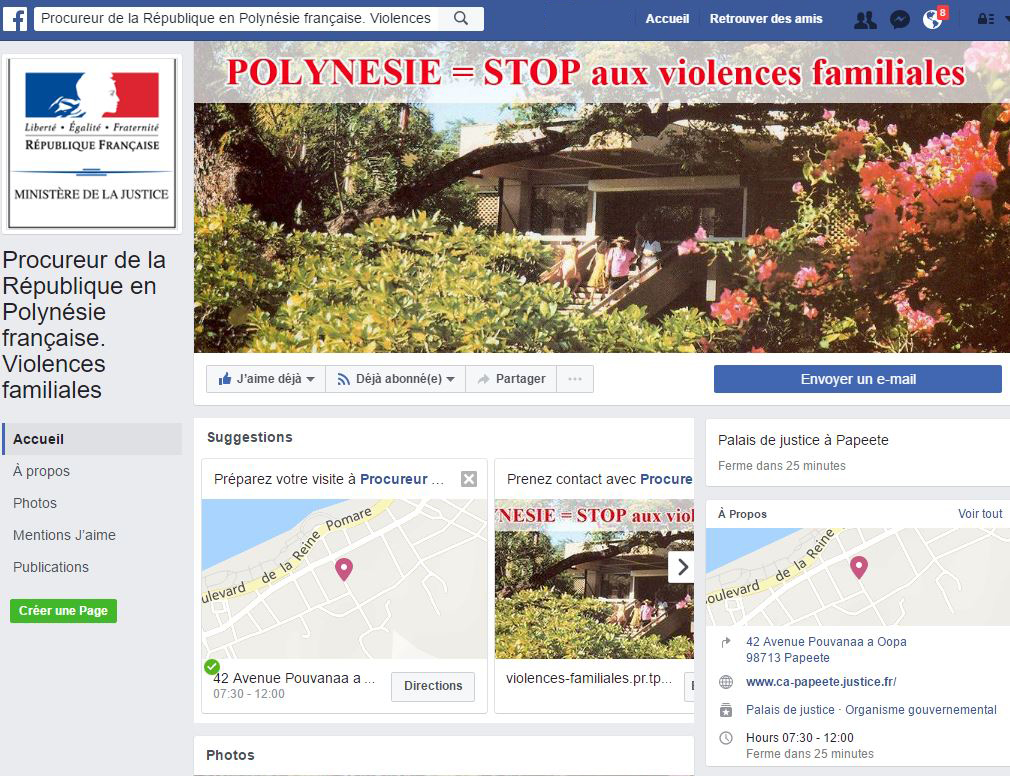 Initiée l'année dernière par le procureur de la République José Thorel et ouverte par son successeur Hervé Leroy, la page Facebook du parquet de Papeete est l'une des réalisations du plan d'action en matière de prévention des violences intrafamiliales, adopté en mars 2016 par le conseil de prévention de la délinquance en Polynésie française. Les services du haut-commissariat, qui ont eux-aussi fait leur mue sur Facebook, ont assuré le maquettage de la page.