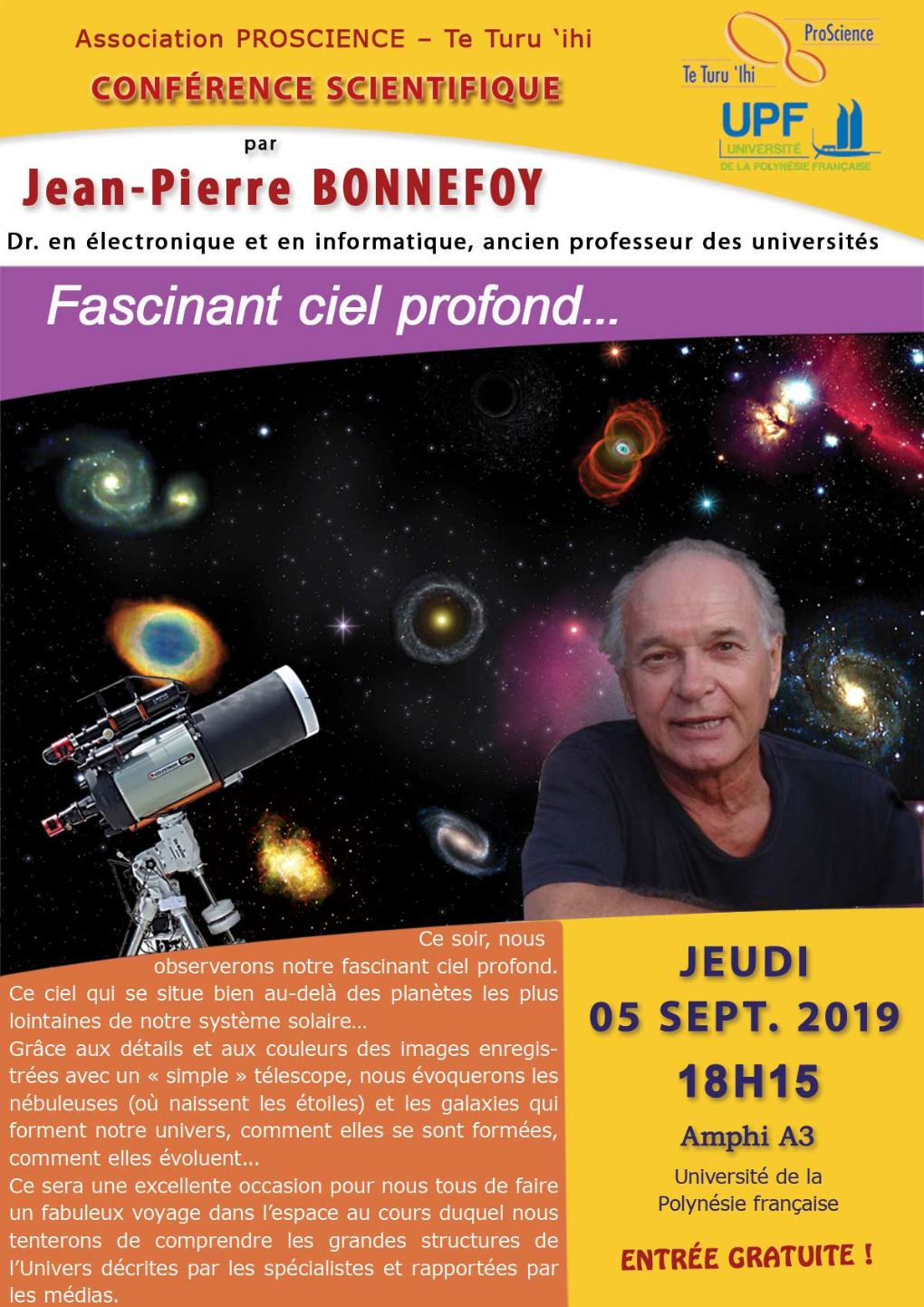 PAPEETE, le 22 août 2019 - L’association Proscience, en partenariat avec l’université, donne la parole à Jean-Pierre Bonnefoy. Passionné par l’observation du ciel profond, ce territoire qui démarre au-delà de notre système solaire, Jean-Pierre Bonnefoy promet une conférence "très visuelle".