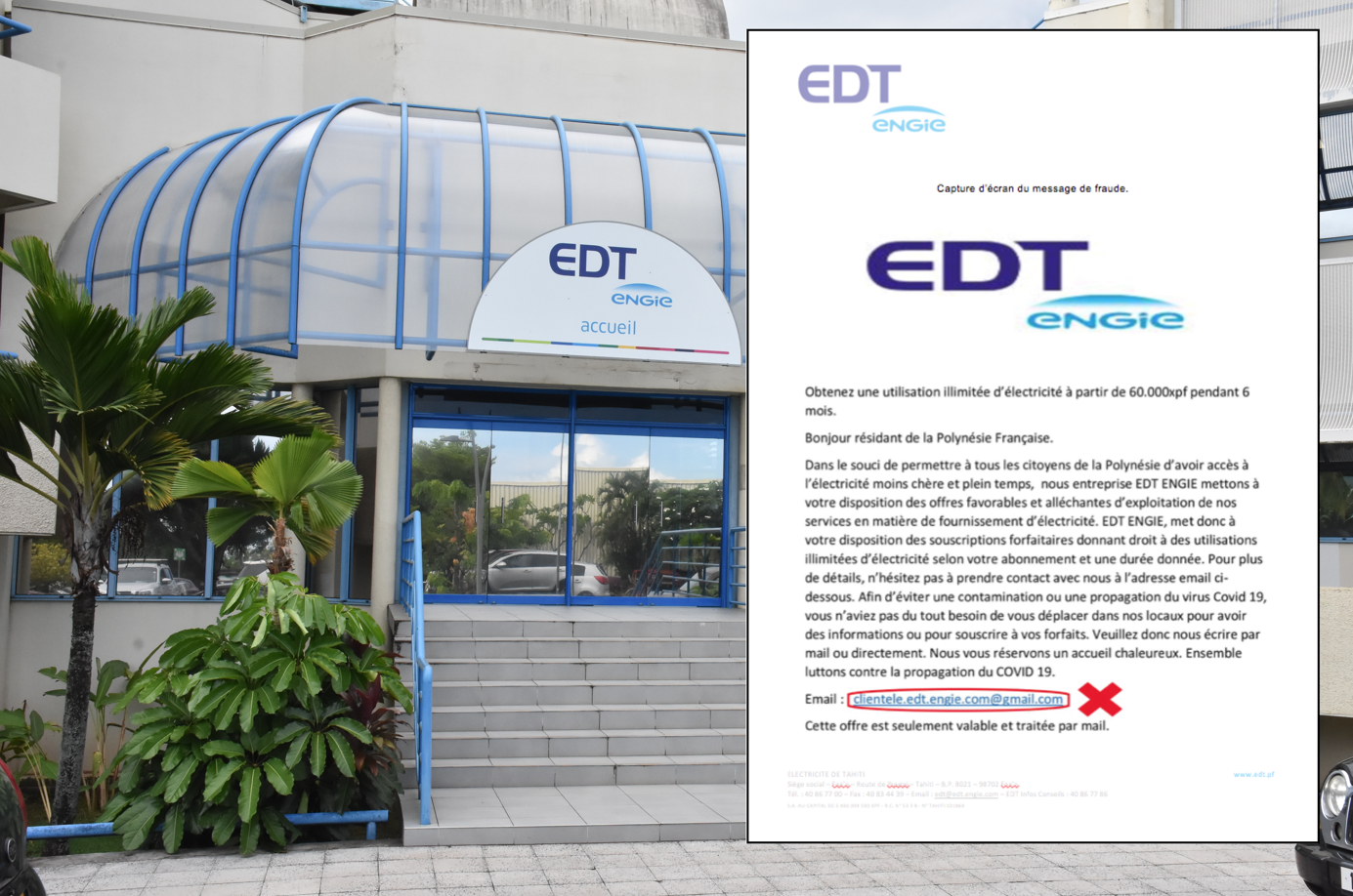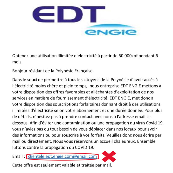 "Obtenez une utilisation illimitée d'électricité à partir de 60 000 Fcfp pendant six mois". L'annonce proposant une souscription forfaitaire alléchante, agrémentée de quelques fautes d'orthographes, est à l'en-tête exacte du distributeur d'électricité en Polynésie EDT. Son mail de contact n'est pas très éloigné de l'adresse officielle du service clientèle de la société. Et surtout, l'ensemble des références légales et numéros de téléphone correspondent à ceux du siège de Faa'a… Il s'agit pourtant d'une escroquerie en bonne et due forme. L'objectif pour l'escroc étant souvent d'obtenir un virement bancaire de sa victime en se faisant passer pour le service client d'une société. EDT a communiqué lundi sur cette annonce et appelle ses clients à la "vigilance" en rappelant que l’adresse mail de son service clientèle est : [email protected] . "Si vous recevez un message indiquant une autre adresse email, nous vous remercions de le signaler en appelant au 40 86 77 86", conseille le fournisseur d'électricité.