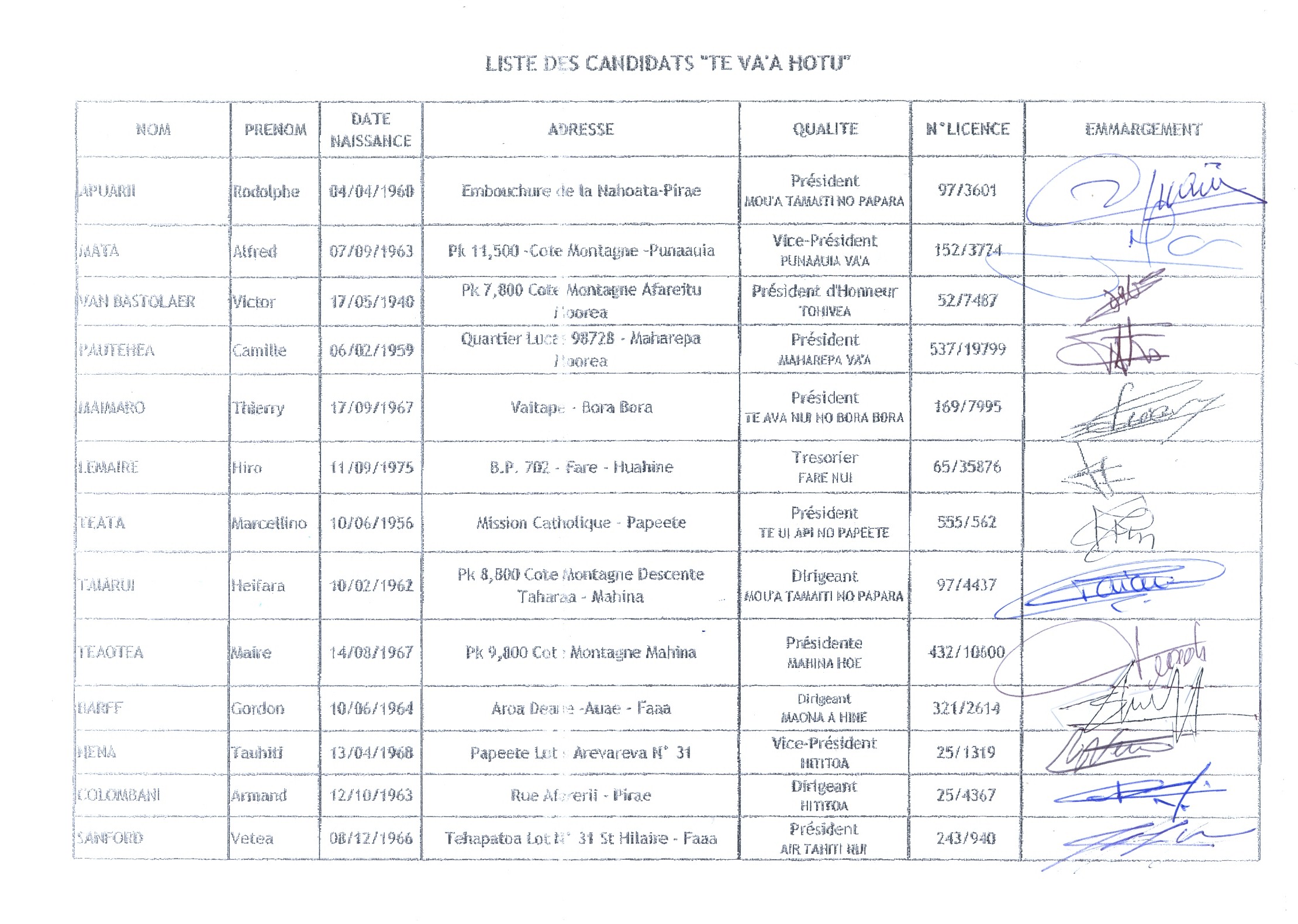 Sur cette liste ‘dissidente’ figurent également Hiro Lemaire de Huahine, Tauhiti Nena de Hititoa, Gordon Barff du club Maona a Hine, Vetea Sanford le président du club Air Tahiti Nui. Rappelons que sur cette 2e liste, Tauhiti Nena est le président du comité olympique et que Gordon Barff était chef de mission de la délégation tahitienne aux derniers jeux du Pacifique.