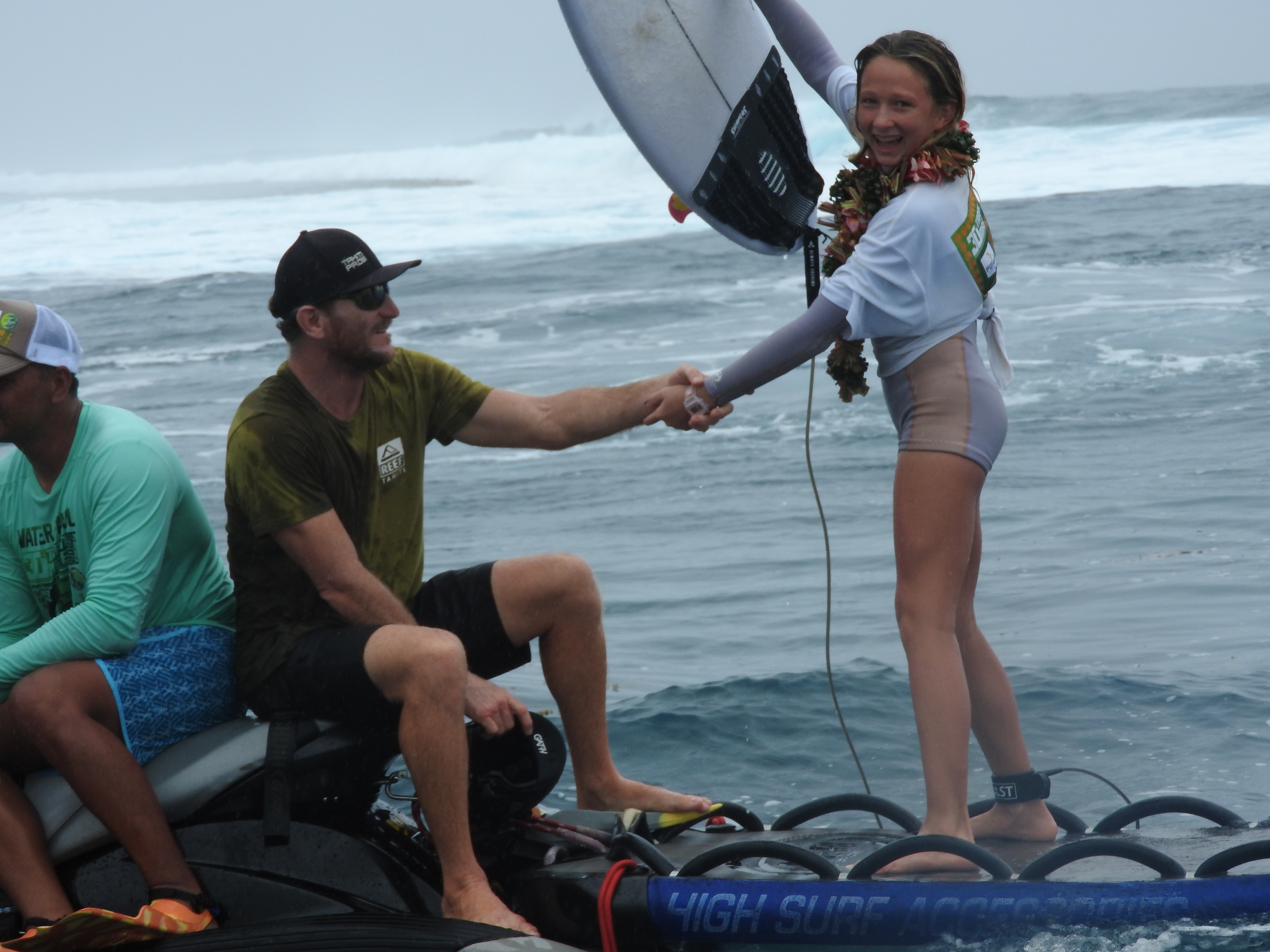 Le week-end a été particulièrement riche en émotions. Samedi matin, les séries éliminatoires pour les hommes en surf se sont intensifiées, tandis que l’entrée en lice des drop knee hommes a été saluée par l’assistance. Cette discipline, inventée à la fin des années 1970, consiste à surfer avec un genou sur l’arrière et un pied sur l’avant de la planche, permettant des figures spectaculaires pour le plus grand plaisir des pratiquants et du public. L’après-midi, les quarts de finale ont été disputés pour les catégories surf hommes et drop knee hommes. Dimanche a apporté son lot d’émotions, avec l’entrée en lice des femmes. Quatre séries, suivies d’une demi-finale et d’une finale, ont célébré la meilleure surfeuse de cette compétition de récif, l’une des rares sur l’île. Et c’est la toute jeune Miliani Simon, du haut de ses treize ans, qui s’est imposée de la plus belle des manières, tant le niveau était élevé lors de cette finale. Face aux sœurs Fierro, les cadettes de Vahine, elle a su résister aux assauts de ses concurrentes en prenant deux vagues magnifiques.