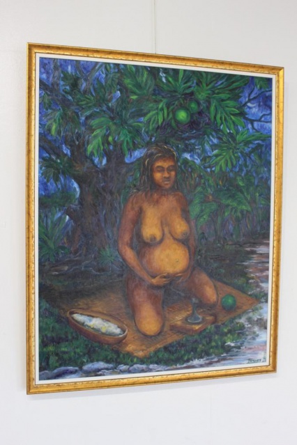 Au mur de la salle Muriāvai où il vient d’installer ses tableaux, il y a des nus, des vues comme celle du port de Papeete ou celle du cocotier qui émerge de la verdure face au fare de l’artiste, des souvenirs de Nouvelle-Zélande ou bien du Japon.