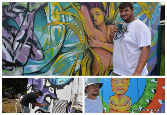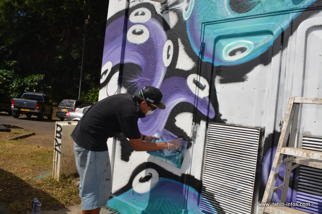 PAPEETE, le 8 avril 2014. Depuis lundi, cinq artistes graffeurs locaux sélectionnés pour le festival international du graffiti Ono’u s’activent sur des postes électriques de Papeete pour les mettre en couleurs. Le public sera invité à la fin du mois d'avril et en collaboration avec Polynésie 1re à choisir son artiste coup de cœur. Il s'agit d'un préambule au festival et au concours international d’art graffiti des 10 et 11 mai prochains sur la place To’ata. Les cinq artistes locaux sélectionnés pour représenter la Polynésie française lors des battles de graff face aux artistes venus du monde entier, travaillent sur des postes électriques en centre ville, grâce à un partenariat avec EDT.