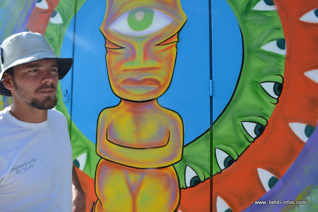 A 30 ans, HTJ pour Hell Ton Jonh a déjà passé la moitié de sa vie à pratiquer le graffiti. Graphiste patenté aujourd’hui, il reconnaît néanmoins que sa pratique graphique a évolué naturellement vers la peinture, avec une spécialité avérée et délibérément choisie pour le street art. Il a d’ailleurs délaissé les bombes de couleurs pour les pinceaux. «J’ai des commandes pour ça et j’expose une fois par an à la galerie Winkler pour faire connaître mon travail». Pour ce travail en pleine rue, devant le restaurant Mac Do de Papeete, HTJ est parti au feeling à partir de l’élément central de son œuvre en gestation, à partir d’un tiki à œil de cyclope. Beaucoup de couleurs vives dans ce travail. HTJ assure que sa performance en live va durer au moins jusqu’à ce soir, alors si vous voulez le voir à l’œuvre avec ses pinceaux, c’est le moment.