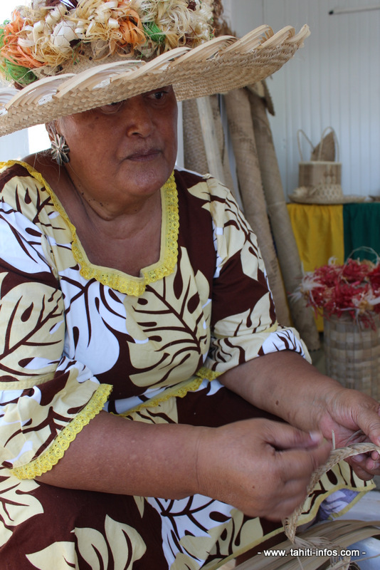 Melita Tavita fait partie de la délégation venue des Australes. Originaire de Rurutu, cette dame au grand chapeau tresse le pandanus depuis l'âge de cinq ans. Elle a fait de cette passion son quotidien et souhaite la partager avec les visiteurs du village.