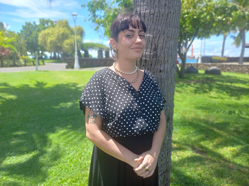 Cartouche Louise-Michèle est une artiste pluridisciplinaire de 27 ans. Elle a grandi sur l'île de Tahiti. Après le lycée, elle est partie en région parisienne où elle a vécu 6 ans. Ouvertement queer, se promenant librement dans son identité de genre, elle s’est rapprochée de la communauté LGBTQIA+ et des groupes militants féministes intersectionnels. “Lors de notre premier échange Raynald m’a dit vouloir travailler avec quelqu’un qui n’était pas seulement sensible au sujet, mais qui était vraiment impliquée. Je suis une femme LGBT, et je l’assume. Nous ne sommes pas nombreuses dans ce cas en Polynésie.”