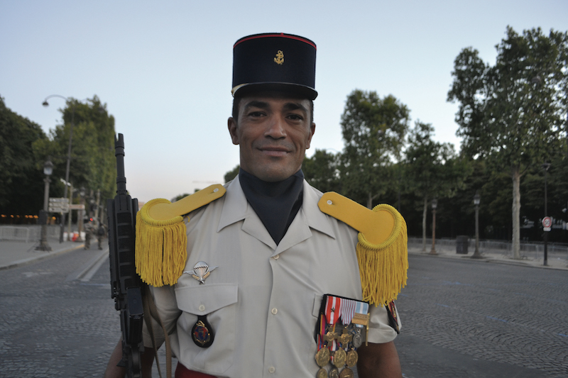 David est caporal-chef dans le 5e régiment interarmes d'Outre-mer, basé à Djibouti, dans un centre d'aguerrissement du désert. Originaire de Tahiti, lui aussi défile aujourd'hui sur les Champs-Élysées pour la première fois. Il sert dans l'armée depuis 18 ans et “ce défilé est un moment important parce qu'on est désignés, choisis, c'est un moment important dans la carrière militaire.” Avec ses camarades, il s'entraîne depuis plus d'un mois pour cet instant complexe, où des milliers d'hommes et de véhicules doivent être à l'unisson, parfaitement coordonnés.