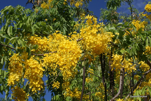 Originaire du Sud Est asiatique, le cassier d’or, de la famille des Fabacées, perd ses feuilles au moment de sa floraison, ce qui met en relief le jaune d’or de ses prodigieuses grappes florales. C’est sans doute l’un des plus beaux arbres ornementaux introduits en Polynésie française. Dommage qu’il ne fleurisse qu’entre décembre et mars !
