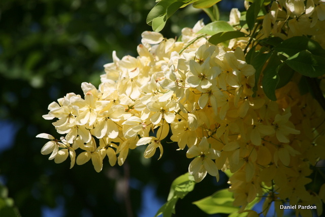 A partir de l’hybridation, à Hawaii, de Cassia javanica et de Cassia fistula, les cultivars de Cassia x nealii ont été multipliés, afin d’obtenir différentes nuances de coloration ; certains, comme celui-ci, produisent des grappes de fleurs d’un jaune très pâle, aussi fournies que celles mêlant le jaune et le rose.