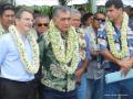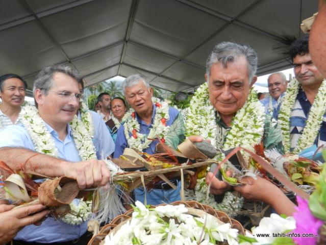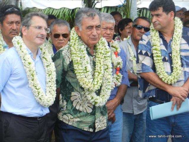 Oscar Temaru, le président de Polynésie française avec Henri Tauraa, Président de la Chambre d'agriculture et Kalani Teixeira, ministre de l'Agriculture de Polynésie.