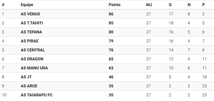 Vénus est donc bien le champion de la saison 2018-2019 avec 86 points et Tiare Tahiti est deuxième avec 85 points. L’ensemble des 10 équipes ont joué leurs 27 matchs, le championnat 2018-2019 est donc terminé. Ces deux équipes sont donc qualifiées pour représenter la Polynésie française lors de la Ligue des clubs champions OFC 2020.
