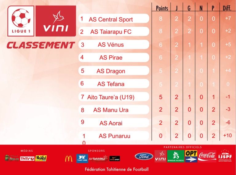 Attention malgré tout puisque Vénus a été tenu en échec par Pirae et totalise pour l’instant un nul et une victoire, ce qui lui permet d’être 3e au classement. Teaonui Tehau a marqué samedi après midi les six buts du 6-1 contre le promu Aorai. Teaonui Tehau est actuellement premier du classement des buteurs de Ligue 1.