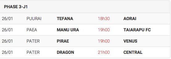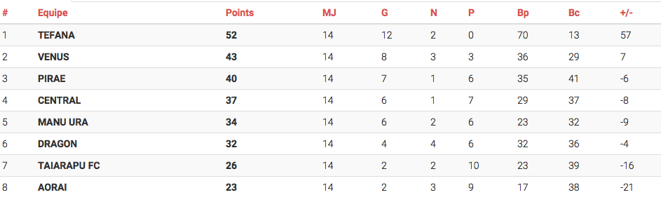 Manu Ura a arraché une victoire importante face à un adversaire direct pour l’accession aux demi-finales du championnat, Central. Le score final : 3-2 en faveur des joueurs de Paea. Le scénario était totalement fou puisqu’après avoir mené 2-0, les joueurs de Paea ont vu Central revenir à 2-2 avant que Garry Rochette ne les sorte de ce mauvais pas. Les buts des mauves : Rooarii Roo (81ème) et un doublé de Garry Rochette (60ème et 90ème). Les buts des rouges et noirs : Jay Warren (85ème) et Michel Maihi (87ème).