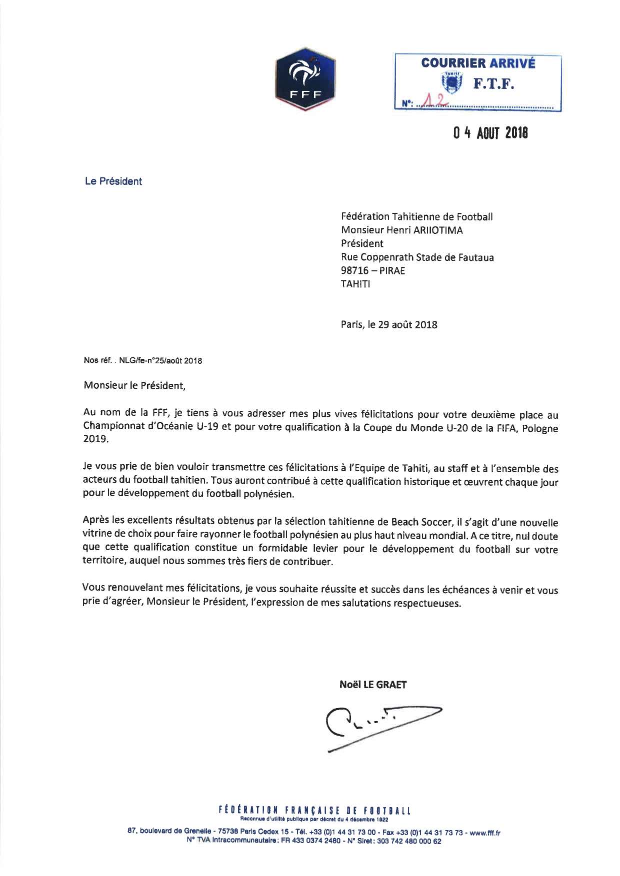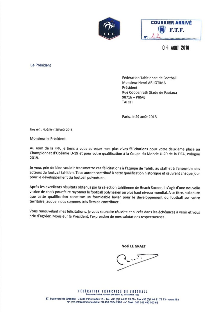 Dans sa lettre, M. LE GRAET salue le travail réalisé par tous les acteurs du football polynésien : la FTF, ses clubs affiliés et tous les éducateurs et bénévoles qui œuvrent chaque semaine sur les terrains de Polynésie pour le développement des jeunes footballeurs.
