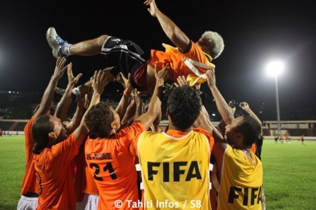 Teva Zaveroni revient du vestiaire pour exulter avec ses coéquipier de l'as Pirae, qui portent en triomphe Gérard Kautai, l'entraîneur. La joie est intense, le titre de champion vient de se jouer sur le dernier match de la saison. L'as Pirae, qui se prépare à jouer la O'league, termine le championnat sur une bonne performance.