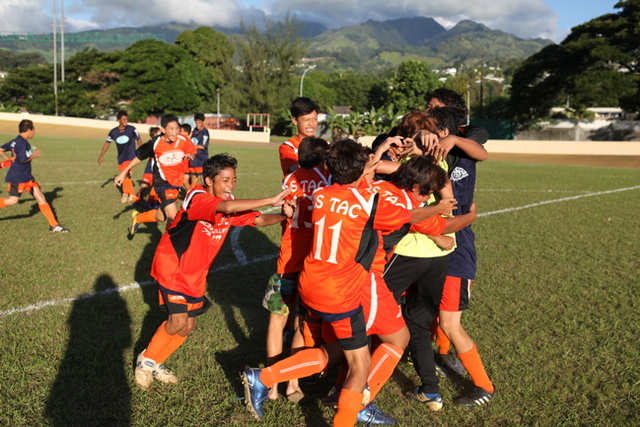 La finale s’est terminée par des tirs au buts des U14 (pas de prolongations pour les catégories U14, 017, U20) entre TAC et TIARE ANANI. Ils étaient à 1-1 à la fin du temps réglementaire, puis le public a assisté à une séance de tirs haletante jusqu’à 6-6, puis à un arrêt du gardien et à un but dans la foulée, suivi d’un assaut de congratulations pour le gardien de l’As Tac.