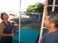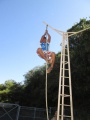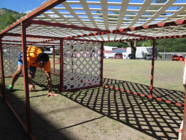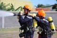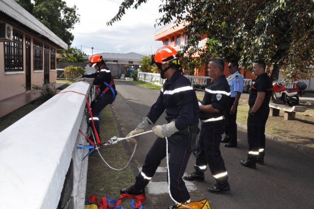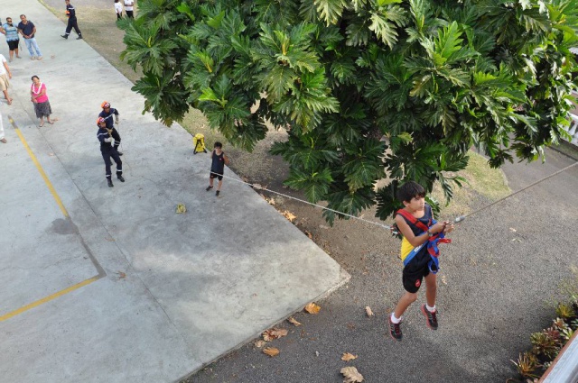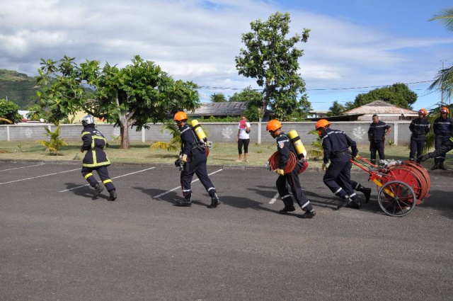 L'après-midi allait enfin permettre aux JSP de se mettre en condition, mais surtout de démontrer leur capacité à gérer leur stress en situation réelle, en équipe et sous les ordres. Il s'agissait de mettre en pratique un ensemble de pratiques opérationnelles incluant plusieurs situations de figures. En l'occurrence ici, un exercice d'extinction d'un incendie et d'un sauvetage en rappel depuis le toit de l'église protestante de Puna'auia. Le haut-commissaire Lionel Beffre accompagné du contre-amiral Anne Cullère et du maire de la commune Rony Tumahai étaient également de la partie. Les représentant de l'Etat avaient tenu à encourager ces soldats du feu en herbe.