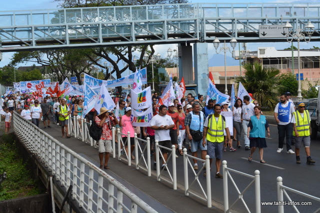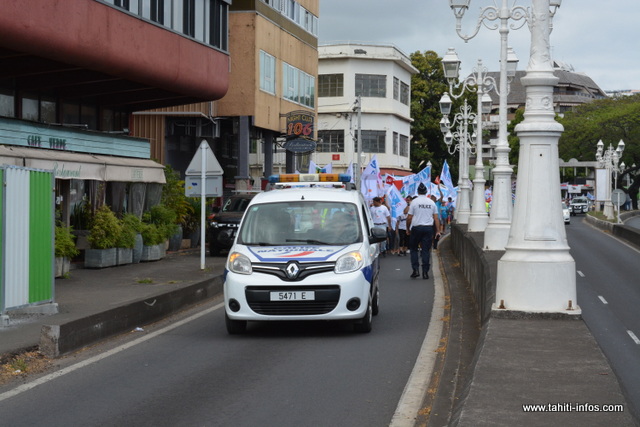 Plus de 1 700 grévistes, selon la police, ont participé à la marche pacifique qui a été mise en place par les syndicats. Le cortège a quitté le stade Willy Bambridge à 9 heures pour se rendre à l'avenue Pouvanaa a Oopa. Une marche qui s'est déroulée dans le calme et qui a nécessité un nombre important de policiers pour encadrer la manifestation. "Il y a le risque qu'un automobiliste perde patience et fonce dans la foule. Donc, il faut qu'on assure la sécurité des manifestants. Et puis, il y a aussi la possibilité des troubles faits ou des contre manifestants qui peuvent venir causer des troubles", explique le commandant Tamatea Tuheiava, chef de l'unité de sécurité et de proximité à la DSP.