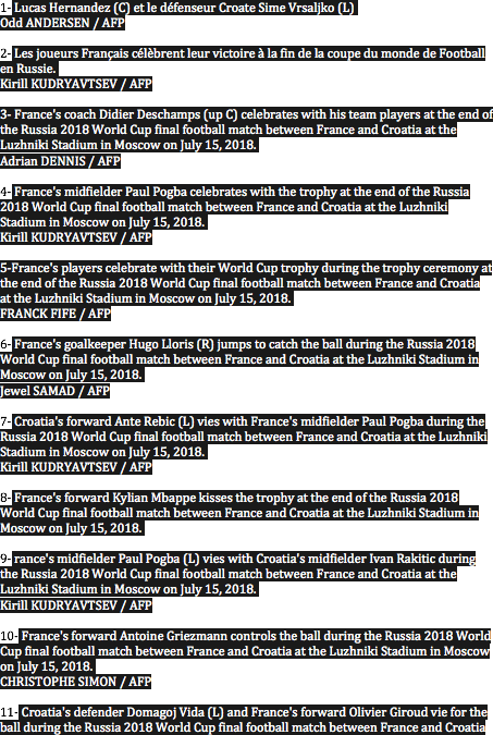Moscou, Russie | AFP | dimanche 15/07/2018 -Champagne ! Le jour de gloire est arrivé pour les Bleus qui ont gagné la deuxième Coupe du monde de leur histoire, 20 ans après celle de 1998, en dominant la Croatie 4-2 au bout d'une incroyable finale du Mondial-2018, dimanche à Moscou.