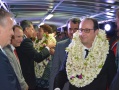 FAA'A le 22 février 2016. Avec un peu d'avance sur l'horaire prévu, l'avion du président de la République en provenance de Wallis s'est posé sur le tarmac de Tahiti Faa'a. François Hollande et la délégation polynésienne ont eu droit à un véritable accueil polynésien avec les élus et autorités locales dès la sortie de l'avion.
