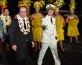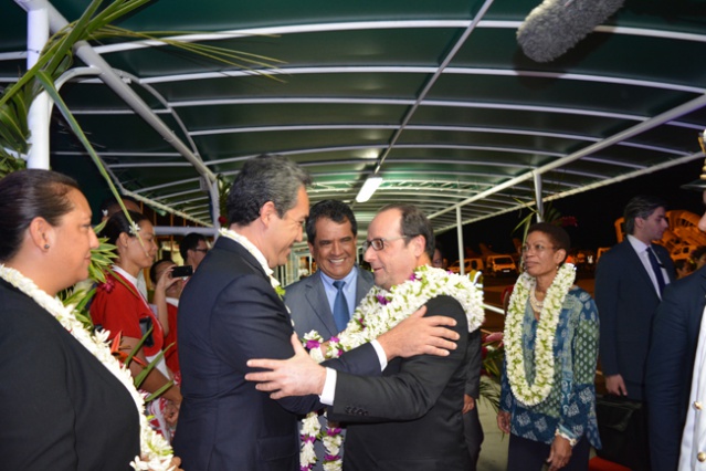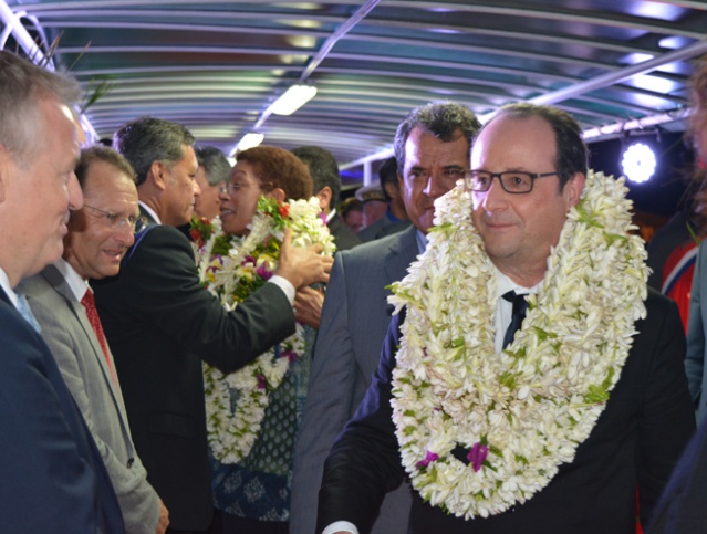 La météo a été nettement plus clémente pour cette arrivée officielle du président de la République alors que ce dimanche matin, c'est sous des trombes d'eau un peu avant 6 heures du matin que la première escale présidentielle à Tahiti a eu lieu. Dans la foulée, la délégation présidentielle s'était envolée pour Wallis. Retour à Tahiti à 22h50, ce dimanche soir, cette fois sous un temps sec et c'est avec plaisir visible que François Hollande s'est enfin retrouvé à Tahiti, au contact des élus et des personnalités venues l'accueillir. Poignées de mains, embrassades, quelques mots échangés avec les élus polynésiens déjà rencontrés à Paris, le président François Hollande a pu assister à une présentation de danses polynésiennes avec le groupe Tahiti Ora de Tumata Robinson.