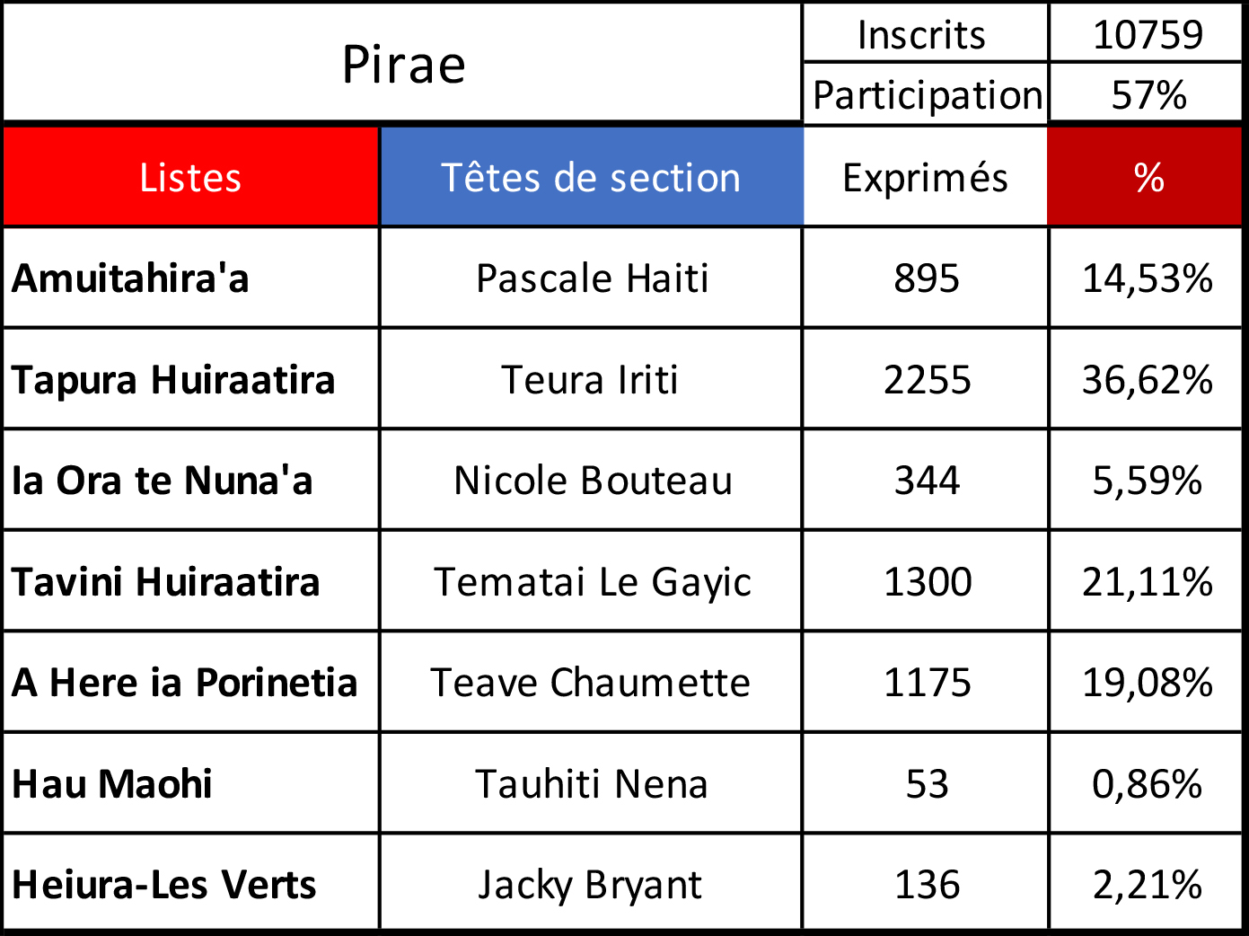 Tahiti, le 16 avril 2023 – La Tapura est arrivé en tête à Pirae, le fief du président sortant Édouard Fritch. Mais le résultat est loin d'être écrasant. Avec seulement 2 255 voix, la liste des rouge et blanc a perdu 1 081 voix par rapport au premier tour des élections territoriales de 2018. La différence a profité au Tavini, arrivé deuxième, qui a quasiment doublé son nombre de voix par rapport aux dernières élections (1 300 contre 668 en 2018). Le A Here arrive juste derrière en troisième position.