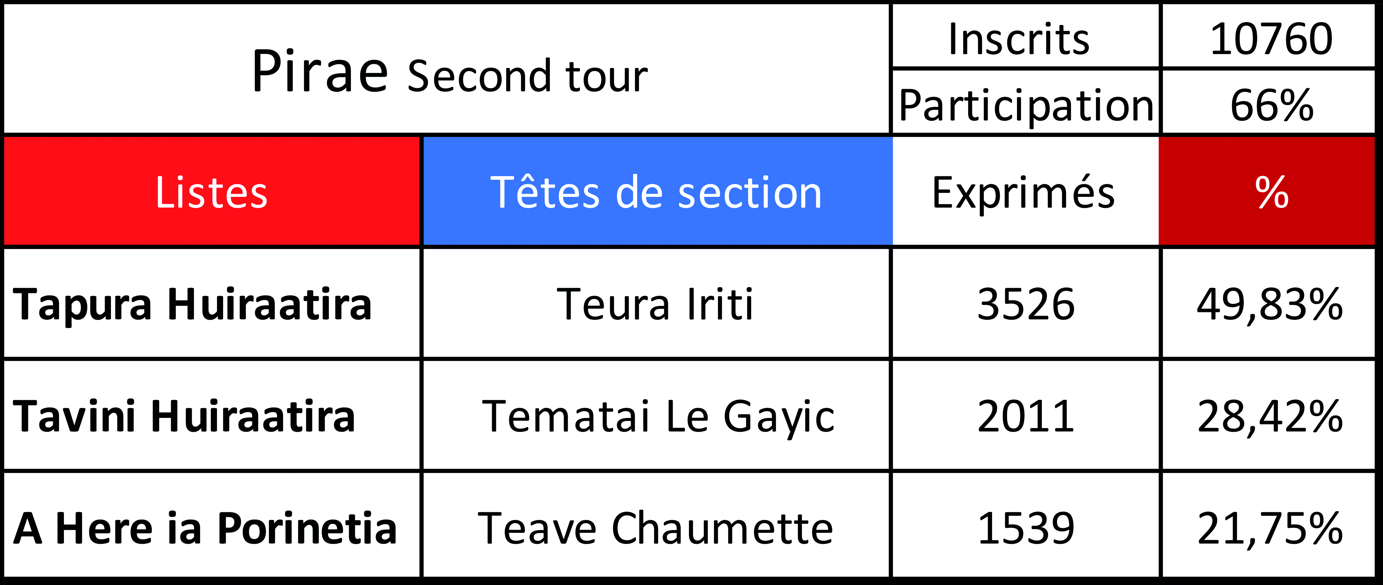 Tahiti, le 30 avril 2023 – En tête mais égratigné par la perte de ses voix à Pirae au premier tour, le président du Tapura et maire de la commune Édouard Fritch a gagné 1 300 voix en deux semaines, quand le Tavini n'en a pris que 700 et A Here un peu moins de 400. Le président sortant échoue à une poignée de voix de la majorité absolue dans sa commune, mais son alliance avec le Amuitahira'a de Gaston Flosse semble avoir payé sur ses terres.