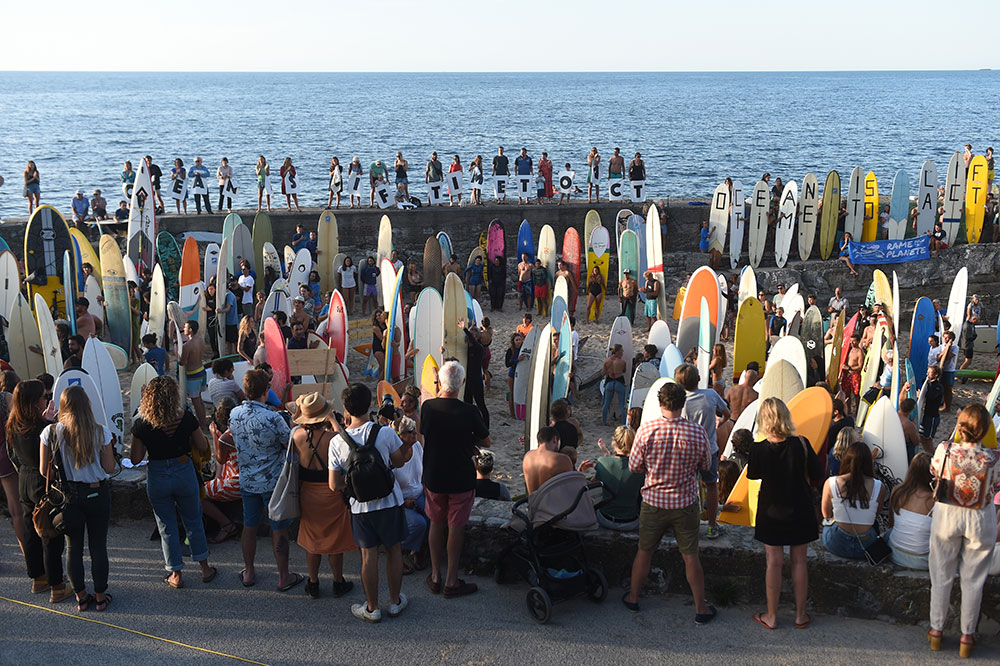 Ils ont formé une chaîne symbolique au large. Sur la petite plage se trouvaient des pancartes plantées dans le sable avec des slogans tels que "La planète se réveille, on s'éveille avec elle", et des messages écrits sur des planches de surf, à l'instar de "océan l'esprit, société au défi".