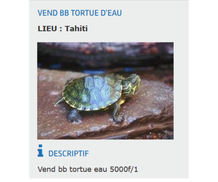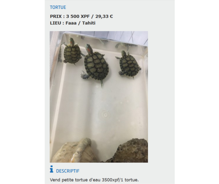 Dans un communiqué publié mardi, la Diren a indiqué que des internautes avaient signalé récemment plusieurs annonces de ventes des tortues de Floride en Polynésie française. La Diren rappelle que la tortue de Floride est déclarée espèce "menaçant la biodiversité" en Polynésie française depuis 2006. Il est donc strictement interdit d’en vendre, de participer à sa propagation ou d’en relâcher dans la nature. Omnivore, elle décime les petites anguilles, les chevrettes et tous les petits animaux qui vivent dans les rivières.