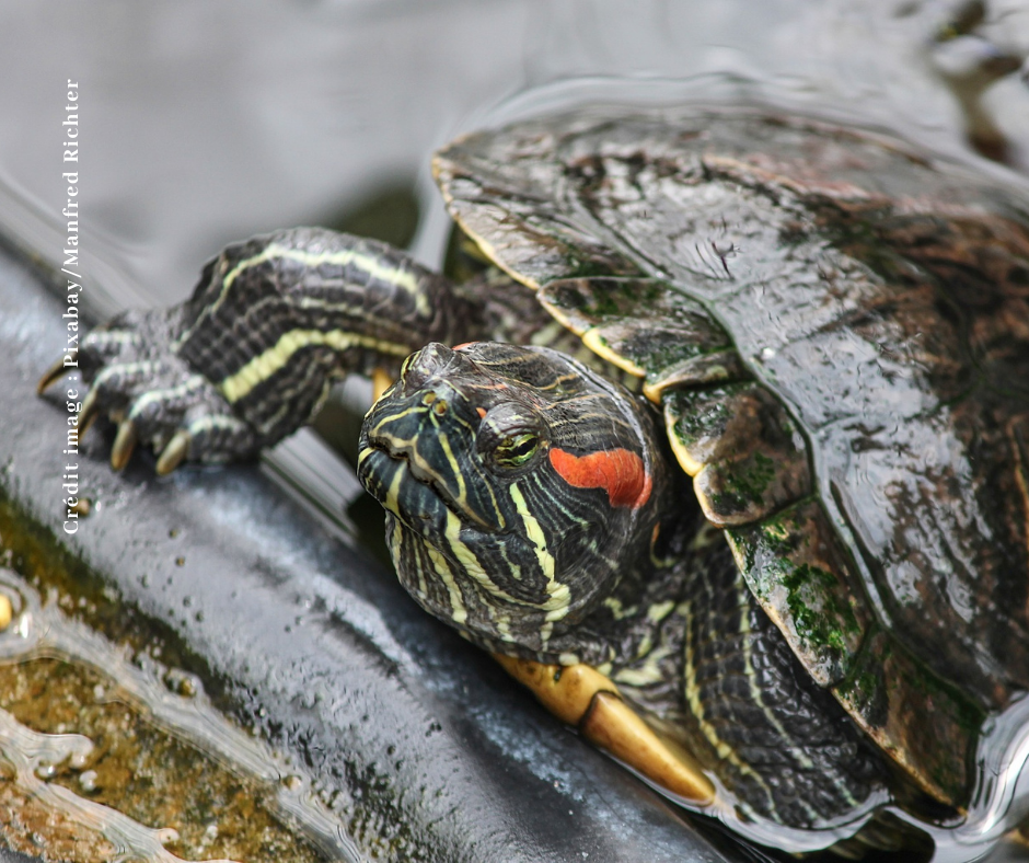 Originaire d'Amérique du nord, la tortue de Floride s'est répandue à travers le monde dans les années 1970. "Elle était vendue dans les animaleries et a réussi à s'acclimater dans de nombreux endroits lorsqu'elle s'est retrouvée dans la nature par accident ou volontairement abandonnée par ses propriétaires". La tortue de Floride peut atteindre jusqu’à 30 cm à l’âge adulte. Avec son plastron jaune et sa carapace dorsale vert-marron à brun, elle est reconnaissable par ses deux taches rouge-orangé sur les côtés de la tête.