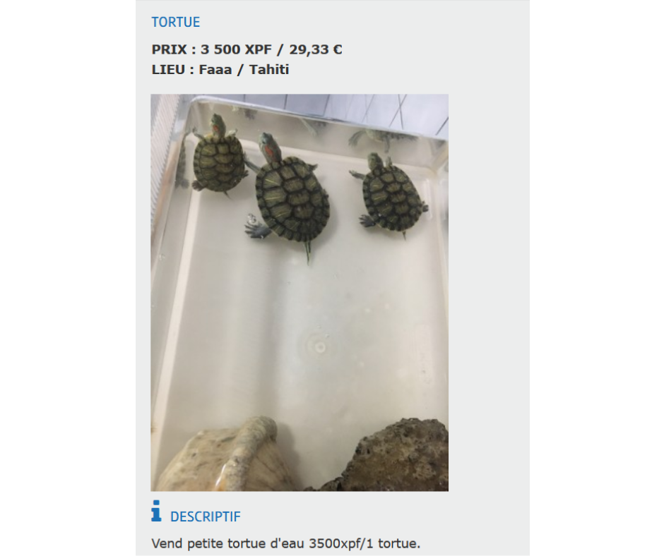 Tahiti, le 25 mai 2021 - Dans un communiqué publié mardi matin, la direction de l’environnement (Diren) a signalé la vente de tortues de Floride en Polynésie française via internet. La tortue de Floride est déclarée espèce "menaçant la biodiversité" au fenua. Il est donc strictement interdit d’en vendre ou d’en relâcher dans la nature.
