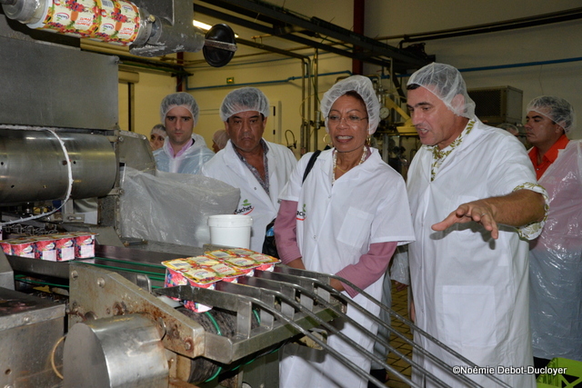 Après la matinée à Moorea (voir Tahiti Infos du 24 mars), George Pau-Langevin a visité la laiterie Sachet d'Arue. Cette société, qui a vendu près de 750 000 litres de lait frais en 2015, a fait une demande de défiscalisation à l'Etat. Ainsi, elle a déposé une demande d’agrément pour l’acquisition d’une unité de conditionnement de yaourts et de divers équipements industriels pour un montant global de 135,6 millions de francs pacifique. Il semblerait que le dossier soit en "bonne voie" selon des proches de la Ministre mais à ce jour, le directeur de la laiterie Sachet, Xavier Fondecave attend toujours la réponse définitive de Bercy.