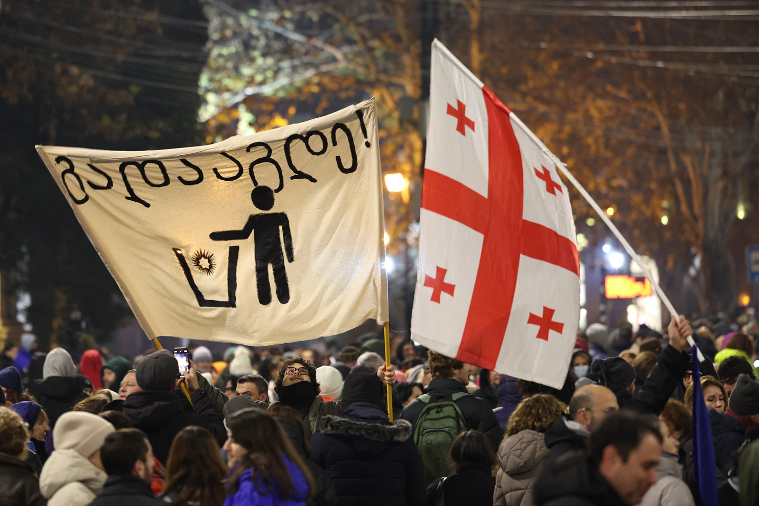 Y était en effet initialement prévue l'illumination d'un sapin de Noël géant par le maire de la capitale Kakha Kaladzé, un autre ex-footballeur international lui aussi membre de Rêve géorgien. Ce que les milliers de manifestants présents voyaient comme une provocation compte tenu du contexte. Ils ont alors hué, sifflé et qualifié d'"esclaves" les responsables du parti au pouvoir.