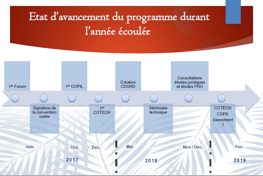 La procédure a déjà été longue, entre les travaux préliminaires, de larges consultations, la signature d’une convention entre l’État, le Pays et les communes, la création de cahiers des charges, des appels d'offres internationaux auxquels 20 bureaux d'études ont répondu, la création d'équipes locales et internationales coordonnées par une instance de suivi interministériel… Aujourd'hui, "les travaux des bureaux d’études sont engagés dès ce mois de février et se dérouleront sur toute l’année 2019. (…) Le chef de file de chaque PRU est le maire. La coordination d’ensemble sera assurée par la DHV, service du Pays en charge de l’habitat, de la ville et du développement urbain, sous la tutelle du ministère du Logement et de l’aménagement du territoire. Ces projets sont appelés à s’inscrire dans une programmation pluriannuelle."