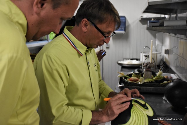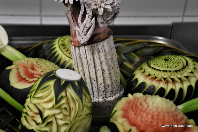 Et cette passion pour les produits de la terre l'a conduit en Polynésie, une destination de rêve, pour lui. Samedi soir, les convives du Te Hura Nui du Méridien ont eu la chance de découvrir les talents de ce grand chef, puisque celui-ci leur a préparé une pièce artistique de plus de 3 mètres. "C'était un petit hommage à Bougainville qui a découvert l'île, il y a plus de 200 ans, en mettant en avant tout ce qu'il a pu voir quand il est arrivé ici. Il y avait un tiki qui tenait des fruits dans ses mains, il y avait aussi une tortue avec des bateaux. J'ai sculpté aussi des fruits en forme d'oiseaux et de fleurs." Le tout ornant le buffet des desserts.