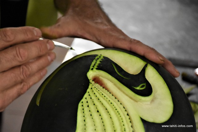 PAPEETE, le 20 août 2018 - Il a été élu meilleur ouvrier de France, en 2011. Parmi les autres prix qu'il a reçus, ceux de champions de France et d'Europe pour les sculptures sur fruits et légumes, en 2008, puis en 2010. Son cheval de bataille, rendre les lettres de noblesse aux produits que nous cultivons.