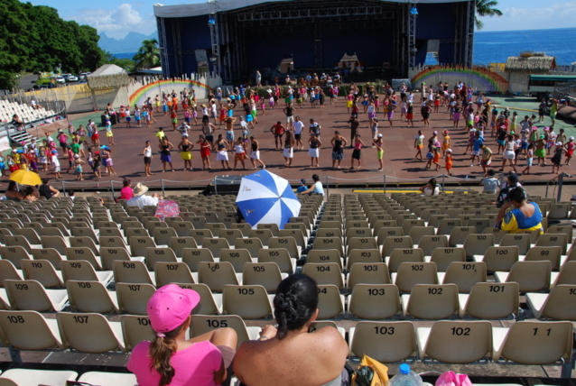 Près de 500 danseurs et danseuses ont, sous un soleil de plomb, pris possession de la grande scène sous le regard attentif de Mamie Louise Kimitete, grande dame de la danse et responsable des classes de 'ori tahiti.